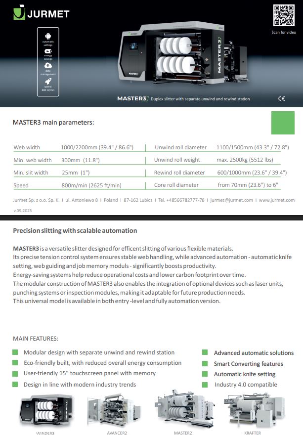 Mit der MASTER3-Schneidemaschine können Sie verschiedene Arten von flexiblen Materialien effektiv schneiden. Die präzise Spannungsregelung sorgt für eine hervorragende Kontrolle des Schneidprozesses, was in Kombination mit automatischen Lösungen wie der Messerpositionierung und einem automatischen Laserpointer zum Positionieren von Hülsen auf Wickelwellen, Bahnsteuerung oder Entladen von fertigen Rollen die Schneideffizienz deutlich erhöht. Darüber hinaus sorgen energiesparende Lösungen über die Jahre hinweg für konsistente, messbare Einsparungen und tragen zur Reduzierung des CO2-Fußabdrucks bei.